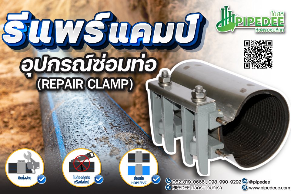 อุปกรณ์ซ่อมท่อ (REPAIR CLAMP) ตราพีบีพี ใช้สำหรับซ่อมท่อประเภท HDPE และท่อประเภท PVC เพื่อเป็นตัวช่วยในการแก้ไขปัญหาท่อแตก หรือท่อรั่วฉุกเฉิน ซึ่งมีคุณสมบัติที่สามารถทนแรงดันน้ำได้ถึง 10 บาร์ วัสดุผลิตจากสแตนเลส 304 โดยอุปกรณ์ซ่อมท่อ HDPE และ PVC นั้นมีความแตกต่างกันเล็กน้อย เพื่อให้เหมาะสมกับรูปแบบของท่อแต่ละประเภท และรูปแบบของลักษณะการใช้งาน ซึ่งมีข้อแตกต่างกันคืออุปกรณ์ซ่อมท่อ (REPAIR CLAMP) สำหรับท่อ HDPE จะมีฟันจับท่อ แต่สำหรับท่อ PVC จะไม่มีฟันสำหรับการจับท่อ ขนาดของ อุปกรณ์ซ่อมท่อ (REPAIR CLAMP) ทั้ง 2 ประเภทจะมีขนาดที่ไม่เท่ากัน เนื่องจากขนาดเส้นผ่านศูนย์กลางของท่อทั้ง 2 ประเภทนั้นไม่เท่ากัน
